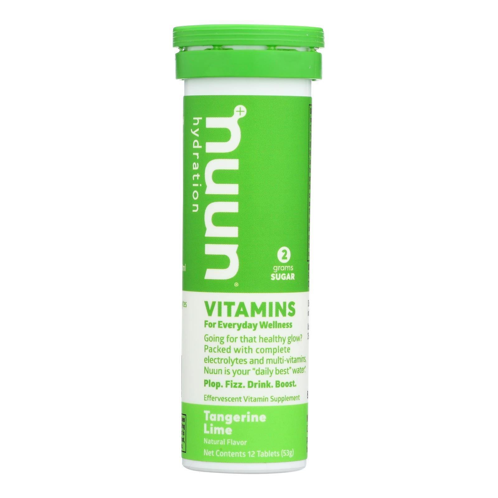 NUUN HYDRATION TANGERINE LIME VITAMIN DRINK TABLETS CAN BE DRANK ANYTIME FOR DAILY HEALTH AND HYDRATION. OUR VITAMIN DRINK TABLETS HYDRATE BETTER THAN WATER ALONE AND PROVIDES WHAT YOUR BODY NEEDS. THE 11 VITAMINS AND MINERALS MOST OF US DONT GET ENOUGH OF, PLUS THE OPTIMAL BALANCE OF ELECTROLYTES FOR EVERYDAY ACTIVITY. OUR FORMULA IS GLUTEN-FREE AND VEGAN FRIENDLY. YOU CAN MAKE YOUR WATER WORK HARDER FOR YOUR HEALTH WHETHER YOU'RE AT WORK, ON THE GO, OR SIMPLY TRYING TO GET IN YOUR 64 OZ. PER DAY. INCLUDES ONE 1.8 OZ. BOTTLE OF 12 NUUN HYDRATION TANGERINE LIME VITAMIN DRINK TABLETS. AT NUUN HYDRATION, WE BELIEVE THAT A COMPANY'S PRINCIPLES ARE AS IMPORTANT AS THE PRODUCTS IT MAKES. WE ARE COMMITTED TO REPLENISHING ACTIVE PEOPLE AND OUR PLANET BY ALWAYS EXAMINING OUR PRACTICES AND VALUING OUR PRINCIPLES OF LIVING CLEAN.